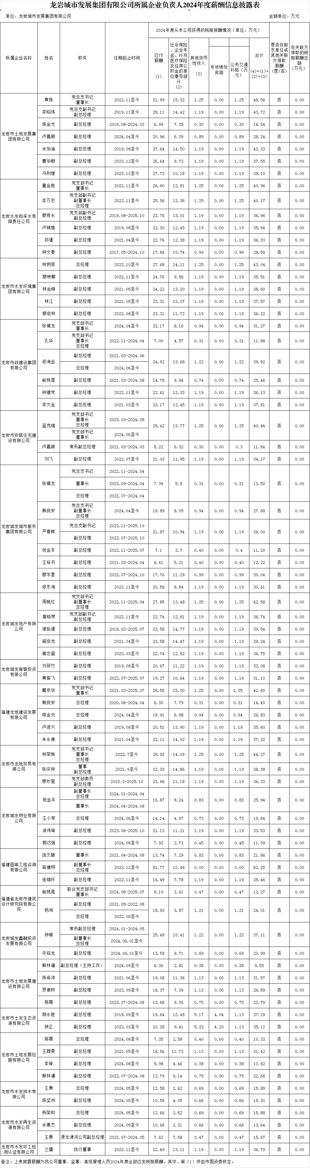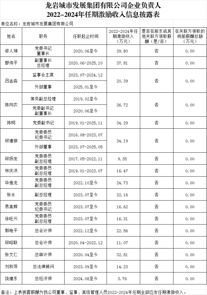 龍巖城市發(fā)展集團有限公司及所屬企業(yè)負(fù)責(zé)人2024年度薪酬、2022-2024年任期激勵收入信息披露表